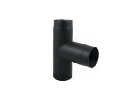 Тройник 90 градусов выполнен из низколегированной стали и окрашен черной термостойкой краской. Предназначен для соединения каминной топки, печи-камина, отопительной печи или банной печи с основным дымоходом. В отличие от угла 90° имеет снизу продолжение трубы, на который в последующем можно установить стакан, который легко снимается для удаления мусора, прочистки дымохода и сбора конденсата.