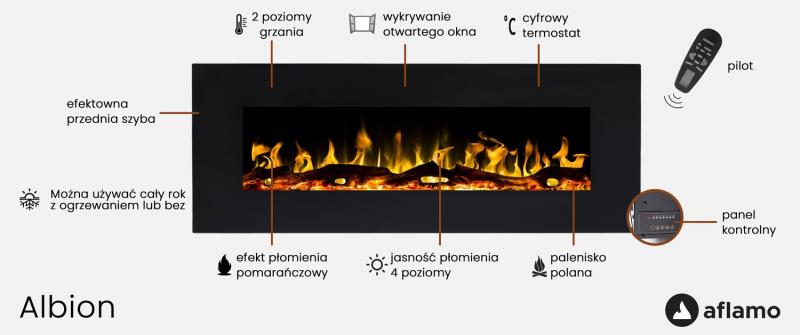 В дополнение к прекрасному эффекту пламени, Albion также выделяет тепло. Таким образом, вы можете почувствовать неповторимую атмосферу камина в своем доме без необходимости установки вентиляционных дымоходов. Другим преимуществом этой модели являются различные уровни яркости и настройки нагрева. 2 уровня тепловой мощности: низкая 750 Вт / высокая 1500 Вт. Регулировка температуры от 18 до 30 ° C, защита от перегрева.