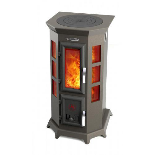 Сексту отличает более сложная архитектура фасада и большая площадь остекления топливника. Дополнительно к остеклению дверцы у этой печи имеется большой остекленный эркер, набранный из отдельных стекол, позволяющих наблюдать за огнем с разных углов зрения.