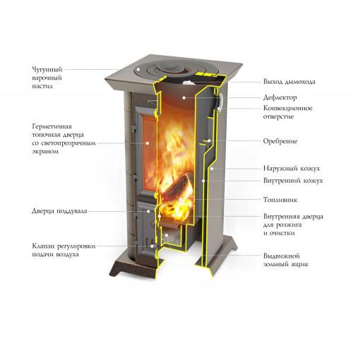 Печь имеет две отдельные чугунные герметичные дверцы. Верхняя дверца топливника оснащена жаропрочным стеклом, а система «чистое стекло», оставляет его чистым с момента растопки до окончания горения. Нижняя дверца зольного ящика позволяет регулировать приток воздуха при помощи заслонки и выбрать любой режим работы печи - от интенсивного до экономичного.