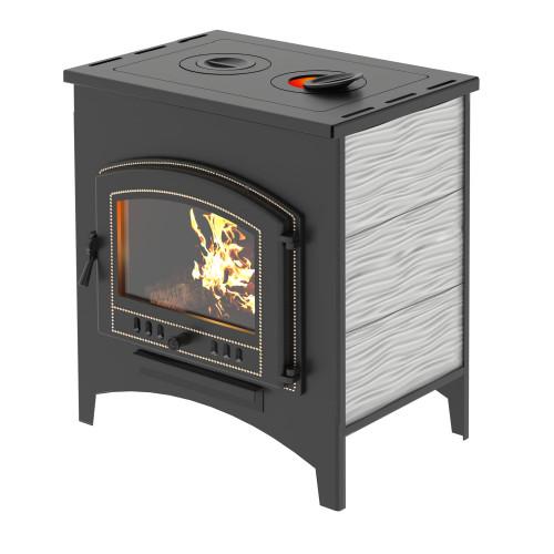 Верхнюю горизонтальную поверхность можно использовать для приготовления пищи. Печь укомплектована чугунным колосником и чугунной негерметичной дверцей Везувий ДТ-4. Печь облицована керамической плиткой для лучшего распределения тепла.