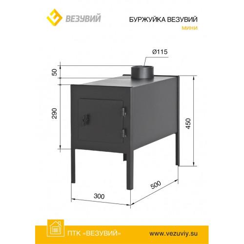 Буржуйка Везувий «Мини» предназначена для установки в различных хозяйственных помещениях небольшого размера, оранжереях, теплицах, гаражах и т. д. Печь изготовлена из специальной конструкционной стали толщиной 5 мм. Верхнюю горизонтальную поверхность можно использовать для приготовления пищи. Печь способна отапливать помещения объемом до 100 м3.