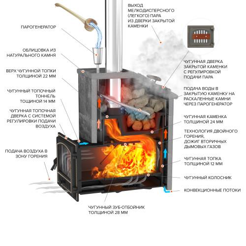 Комплект ПРЕЗИДЕНТ "ЭВЕРЕСТ 24 (280)" ТАЛЬКОХЛОРИТ имеет эксклюзивный дизайн и удачно впишется в практически любой интерьер парного помещения. Облицовка из натурального камня придаст интерьеру лоск и респектабельность.Все элементы комплекта идеально подобраны друг к другу, поэтому не придется покупать их по отдельности, рискуя, что какой-то из элементов не подойдет для вашей банной печи. Приобретение готового комплекта ПРЕЗИДЕНТ "ЭВЕРЕСТ 24 (280)" ТАЛЬКОХЛОРИТ позволит вам сэкономить время и деньги.Талькохлорит – экологически чистый натуральный камень. Он не выделяет вредных веществ при нагревании. Талькохлорит быстро нагревается и хорошо переносит перепады температуры, а также отличается высокой теплоемкостью, поэтому, даже после окончания топки печь или камин с такой облицовкой, продолжительное время продолжает «отдавать» тепло, обогревая помещение. Это отличный материал для создания теплоаккумулирующих каминов. Кроме того, облицовка из талькохлорита придаст утонченную роскошь отопительному прибору, позволяя гармонично вписаться в интерьер помещения