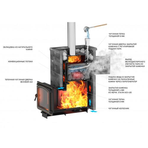 Данную модель печи отличает от аналогов то, что закрытая каменка расположена внутри топки. Это позволяет максимально быстро и хорошо прогревать камни, которые расположены внутри каменки. На камни через специальную трубку с отверстиями поддается вода, которая моментально испаряется, превращаясь в мелкодисперсный пар.