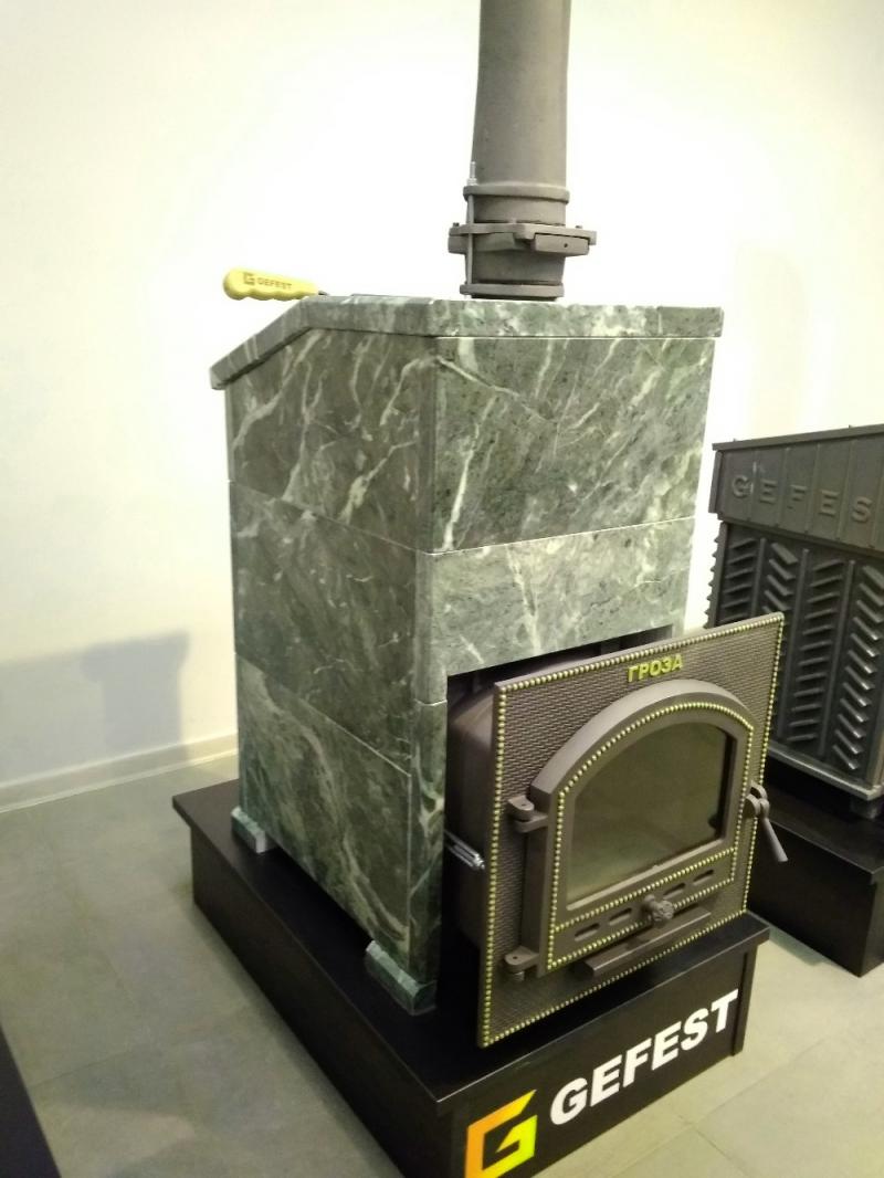 Печь "Гроза - Ураган" (Гроза - Ураган 24ПС) имеет прочную сборную конструкцию, без сварных соединений, детали выполнены из легированного чугуна. Топка печей Gefest Гроза Ураган состоит из двух камер, разделенных пламегасителем. Радиаторные выступы каменки, направленные вглубь топки, увеличивают площадь контакта огня с каменкой и эффективность теплосъема. Для увеличения площади поверхности нагрева камней каменка снаружи оборудована чугунными шипами, направленными вверх. Сами чугунные шипы также являются частью заряда для лучшего испарения воды.