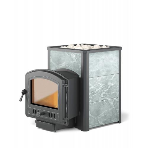 Преимущество печи в том, что топка печи состоит из 3-х ЧУГУННЫХ элементов. На стыке между ними используется керамический шнур с рабочей температурой 1200 градусов. То есть топка печи абсолютно герметична! Для фиксации деталей между собой применяется болтовое соединение, что даёт 100% гарантию безопасности при эксплуатации. Конвекционно–вентилируемая облицовка, изготовленная из экологически чистой горной породы , который обладает большой теплоёмкостью, что позволяет камню в короткие сроки нагреваться и максимально долго удерживать стабильную температуру в парильном помещении, а также гасить жёсткое инфракрасное излучение Камень обладает исключительными лечебными свойствами: помогает при головных болях, при нестабильном артериальном давлении, при простудных заболеваниях, воспалительных процессах в почках и пищеварительной системе, снимает повышенную возбудимость и нервозность, сглаживает эмоциональные всплески. Облицовка из натурального камня при нагреве способна аккумулировать тепло, что гарантирует максимально равномерный прогрев и сохранение тепла Банная печь ЛЕГЕНДА 16 (224) укомплектован чугунной каминной, самоохлаждаемой дверцей Везувий 224 с большим жаропрочным стеклом «SCHOTT ROBAX», с оборудованной системой самоочистки, что позволяет визуально контролировать горение и любоваться видом живого огня. Данная печь рассчитана на объем парильного помещения 8-18 м3.