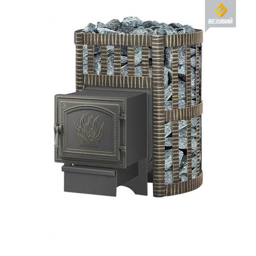 Банная чугунная печь Легенда Ковка 12 (261) укомплектована чугунной герметичной дверцей Везувий 261. Конвекционно-вентилируемый кожух "Ковка" изготовлен из металлической текстурированной полосы покрашенной термостойкой краской и покрытая патиной «Бронза».