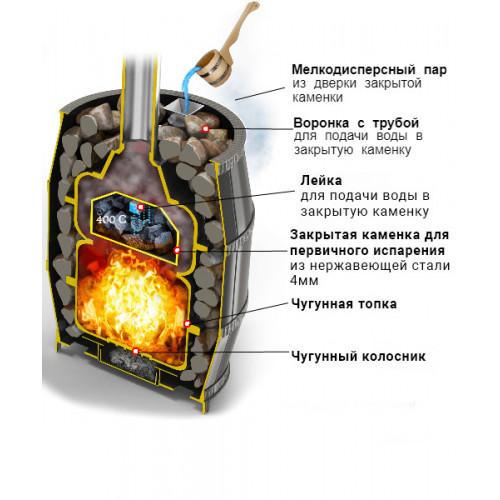 Вода подается в самую горячую центральную часть закрытой каменки через воронку (при этом дверь закрытой каменки должна быть приоткрыта для поступления мелкодисперсного пара в парное отделение) Все элементы топки отлиты из чугуна и соединены между собой с помощью болтового соединения через термостойкий шнур и герметик, а закрытая каменка изготовлена из жаростойкой высоколегированной 4 мм нержавеющей стали.