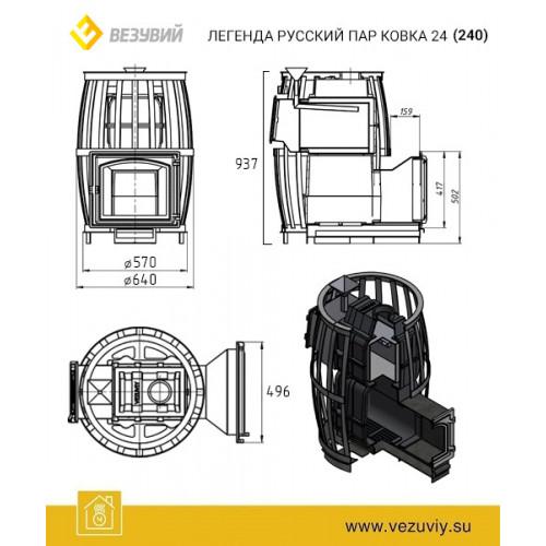 Новая линейка дровяных печей для бани «Легенда Русский пар 24» рассчитанные на парное отделение объемом от 12 до 26 м3. «Легенда Русский пар 24» отличается от своей предшественницы дровяных печей для бани «Легенда Ураган» прежде всего наличием закрытой каменки, которая охваченная круговым потоком пламени, в которой камни прогреваются до температуры 600 °С, что позволяет создать в парилке наиболее благоприятный микроклимат, не пересушивая и не перегревая воздух.