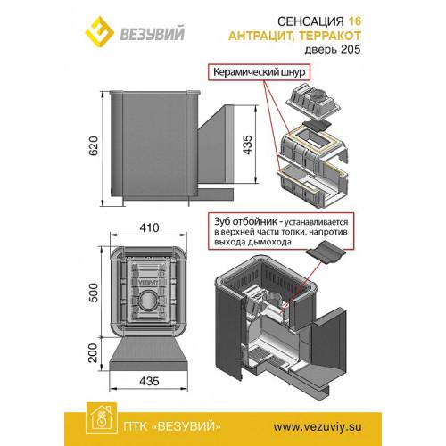 Банная чугунная печь Сенсация 16 (205) укомплектована чугунной герметичной дверцей Везувий 205 с жаропрочным стеклом «SHOT ROBAX». Объемная, вентилируемая каменка позволяющая максимально быстро нагреть камни с четырёх сторон в кратчайшие сроки, что значительно ускоряет нагревание воздуха в парилке за счёт образуемого им мощного конвекционного потока