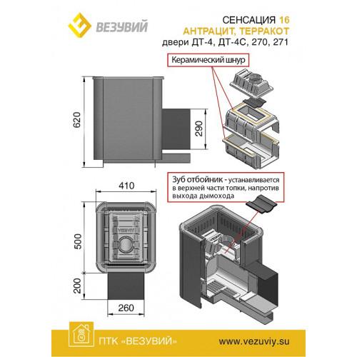 Банная чугунная печь Сенсация 16 (ДТ-4) укомплектована чугунной не герметичной дверцей Везувий ДТ-4. Объемная, вентилируемая каменка позволяющая максимально быстро нагреть камни с четырёх сторон в кратчайшие сроки, что значительно ускоряет нагревание воздуха в парилке за счёт образуемого им мощного конвекционного потока.