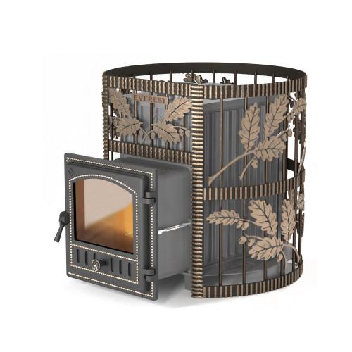 Чугунная банная печь Эверест 24 в кованной сетке.