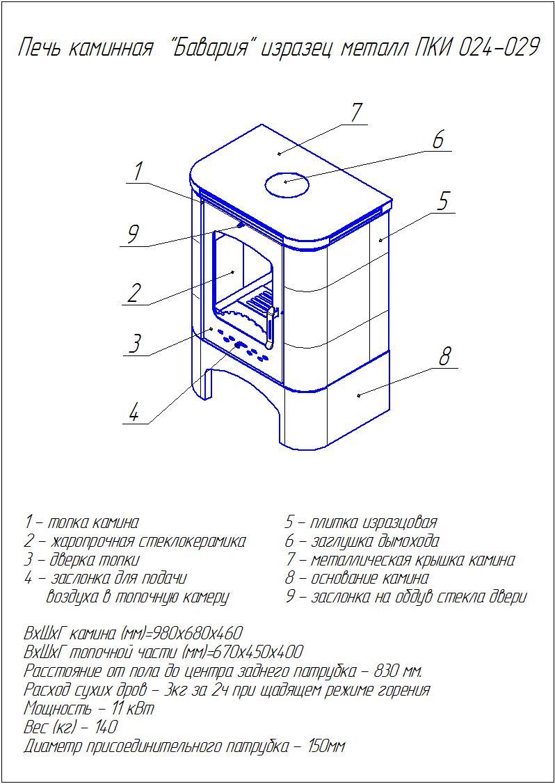 Обогрев помещения осуществляется за счет нагрева корпуса прибора и с помощью конвекционных каналов, находящихся внутри. Одной загрузки топлива достаточно для горения в течение 6-7 часов, а нагревается она буквально за 15-20 минут . Внутри печи и камины «Бавария» обложены шамотным кирпичом для длительного сохранения тепла. Снаружи корпус декорирован керамическими изразцами с оригинальным узором в виде арки. Печь-камин "Бавария" сконструирована так, что доступен свободный обзор пламени.