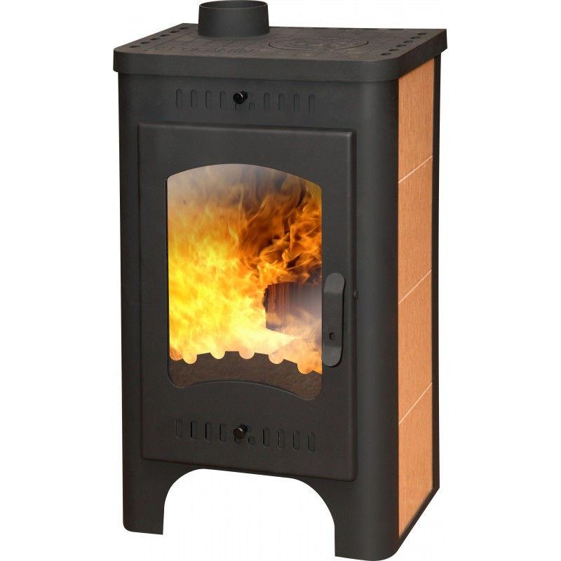 Печь Оптима выполняет декоративную роль камина в помещении благодаря наличию смотрового экрана. Это окошко предназначено в первую очередь для украшения печи и комнаты в целом, но также позволяет контролировать процесс горения при закрытой дверце. Боковые стенки камина облицованы керамической плиткой для придания дополнительной нарядности всей конструкции.