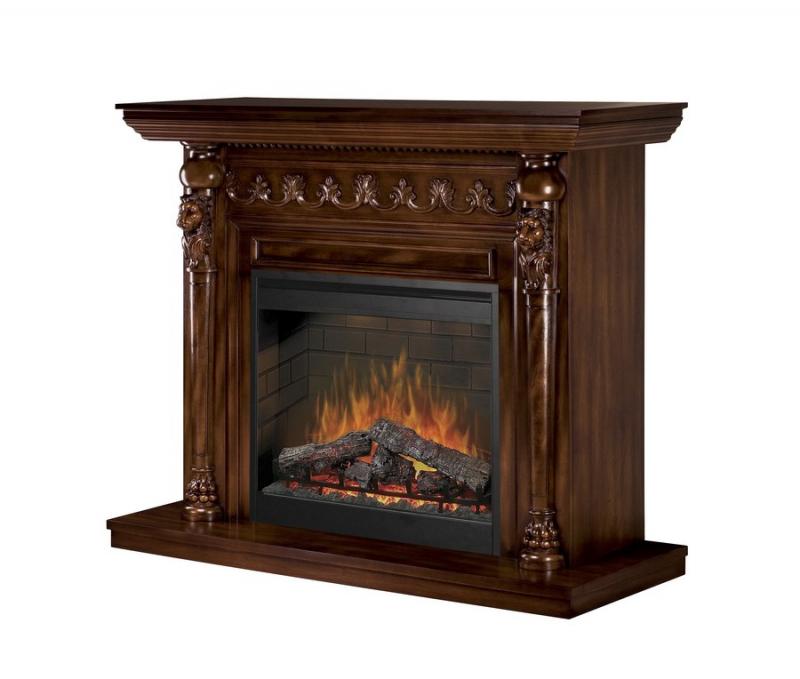 По бокам портала Dimplex Lions Head красуются деревянные львиные головы, дополнительно подчеркивая роскошь и общую монументальность данной каминной композиции. Растительный орнамент в верхней части портала добавляет ему изящества и утонченности, а круглые гладкие навершия декоративных столбов, расположенных по краям очага на резных постаментах, придают обрамлению торжественный и праздничный вид.