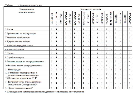 Комплектность котлов – согласно таблице.